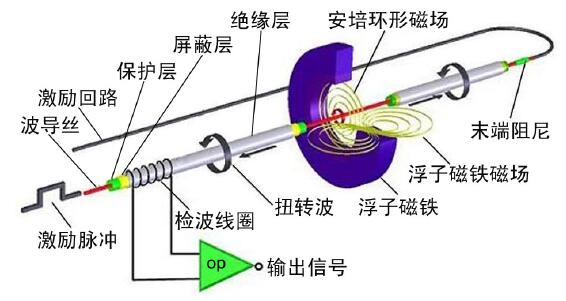 磁致伸縮液位計(jì)主要由電子部件、磁致伸縮波導(dǎo)絲、浮子等部分組成。測(cè)量時(shí),電子部件產(chǎn)生一個(gè)電流“激勵(lì)”脈沖,該脈沖電流以光速沿波導(dǎo)絲向下運(yùn)行,并在波導(dǎo)絲周圍形成周向安培環(huán)形磁場(chǎng)。當(dāng)激勵(lì)脈沖電流產(chǎn)生的環(huán)形磁場(chǎng)與浮子內(nèi)永磁鐵產(chǎn)生的偏置磁場(chǎng)相遇時(shí),浮子周圍的磁場(chǎng)發(fā)生改變,從而使得由磁致伸縮材料做成的波導(dǎo)絲在浮子所在的位置產(chǎn)生一個(gè)感應(yīng)扭轉(zhuǎn)波脈沖,該扭轉(zhuǎn)波以聲速由產(chǎn)生點(diǎn)向波導(dǎo)絲的兩端傳播,傳向末端的扭轉(zhuǎn)波被阻尼器件吸收,傳向激勵(lì)端的信號(hào)則被檢波裝置接收,并由電子部件測(cè)量出脈沖電流與扭轉(zhuǎn)波的時(shí)間差,再乘以扭轉(zhuǎn)波在波導(dǎo)絲中的傳播速度(固定量為2800m/s),即可計(jì)算出浮子產(chǎn)生扭轉(zhuǎn)波的位置與測(cè)量基準(zhǔn)點(diǎn)間的距離,也就是液面的位置。磁致伸縮液位計(jì)傳感器原理見(jiàn)下圖。